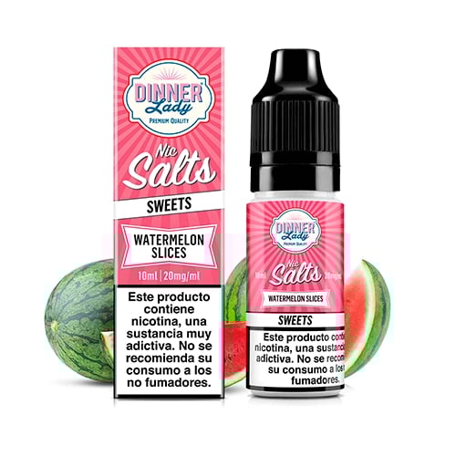 Descubre la mejor selección de sales de nicotina de una de las marcas más prestigiosas en el mundo como es Dinner Lady. Desde las mejores sales frutales hasta las más dulces, ¡no echarás ninguna en falta! El Watermelon Slices Nic Salt presenta un inimitable sabor a la tradicional gominola de sandía, un sabor muy característico y perseguido por todos aquellos fans incondicionales de esta dulce y conocida golosina. Los top ventas de Dinner Lady ahora en formato sales de nicotina para colmar como nunca tu mejor experiencia de vapeo.